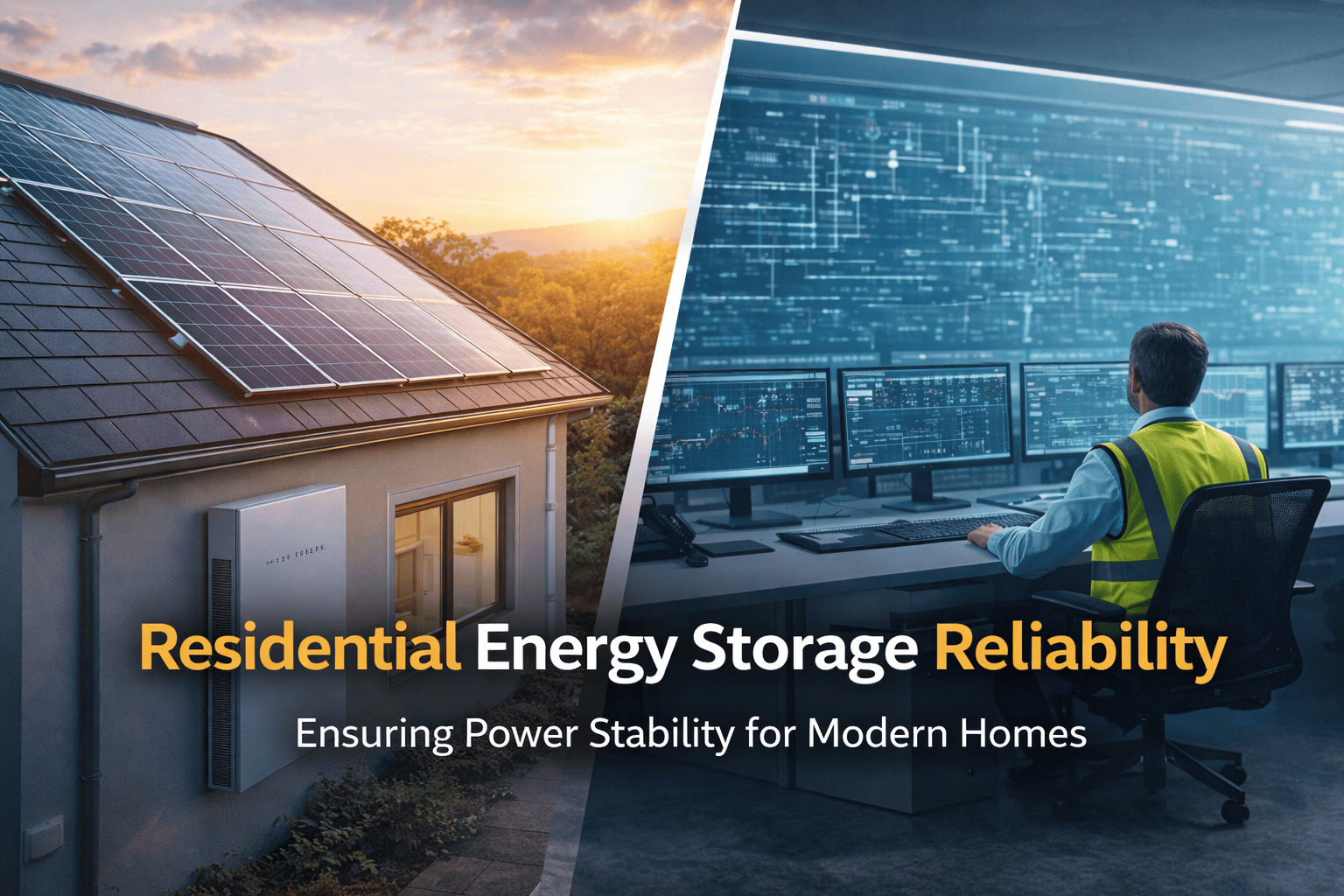 Residential energy storage reliability showing a solar-powered home with battery backup supporting stable power supply